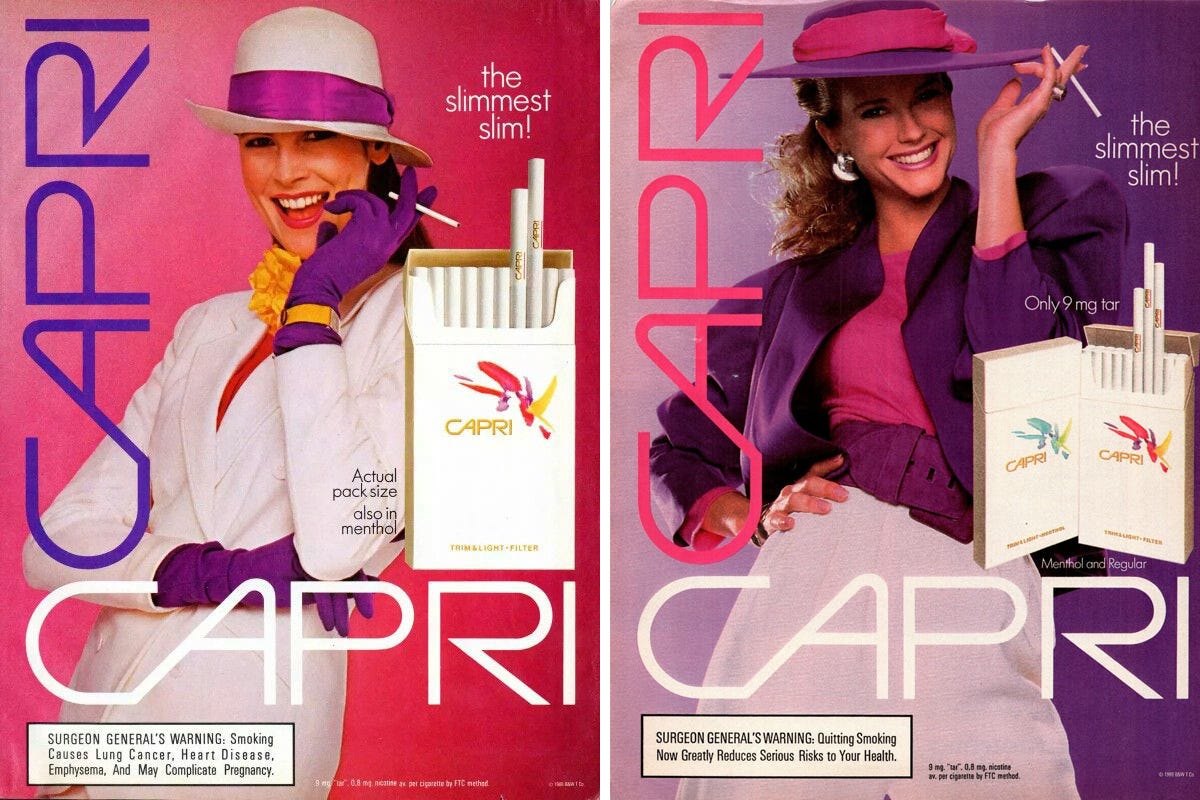 With the help of saturation advertising - in two senses, with the electric ‘80s color palette of the ads - it worked. The toothpick-esque Capri became a best-selling cigarette brand in 60 countries. But going thin wasn’t the only trend affecting the tobacco industry at the time…