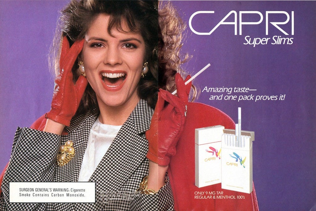 The new Capris weren’t just skinny, they were downright emaciated: where a normal cigarette had a circumference of 25mm and Virginia Slims were at 23mm, Capris were just 17 millimeters around. An extra-long “luxury length” version accented the slimness even more, as did slogans like “The slimmest slim in town” and “There’s no slimmer way to smoke.”