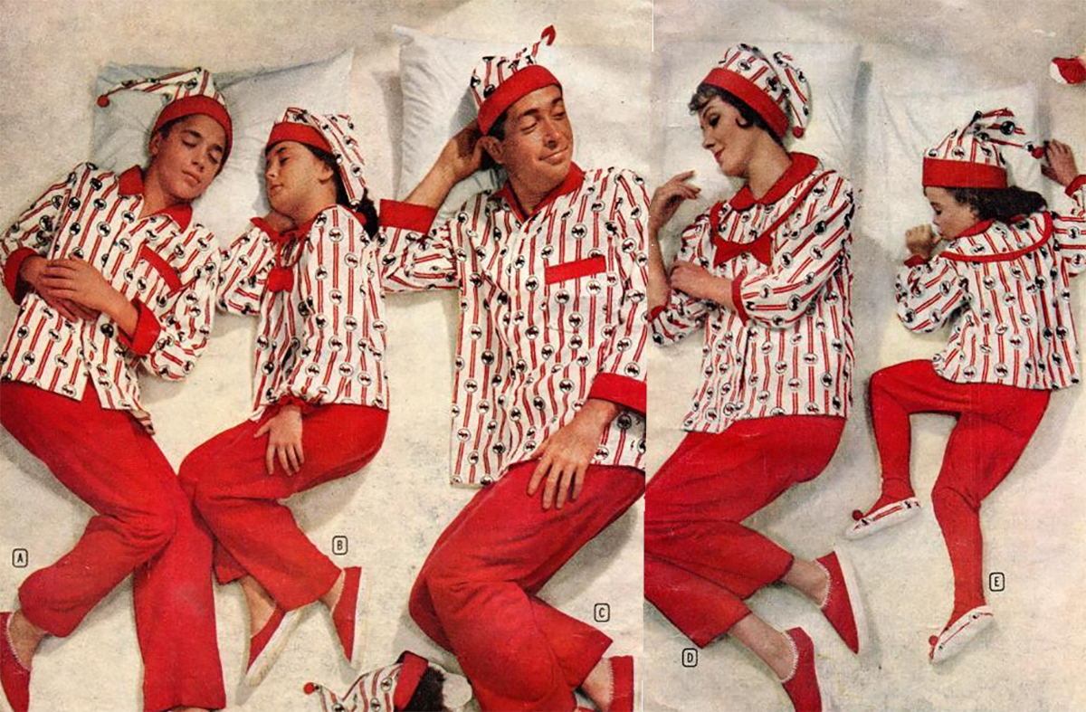 Matching pajamas for Christmas morning seems like an old-timey thing, redolent of a day when families were closer, and people got more into the spirit of Christmas. Well, not to get all Grinchy, but they’re a commercial creation with a very specific start date. Family Christmas sleepwear sets started showing up in catalogs and ads in 1957. (There’d been father-son, mother-daughter, and husband-wife pajama sets before, but not for the whole family, nor with a Christmas angle.) At this point, red and white are the only colors, which is not only a Santa Claus-approved colorway but equally suitable for all ages and genders.