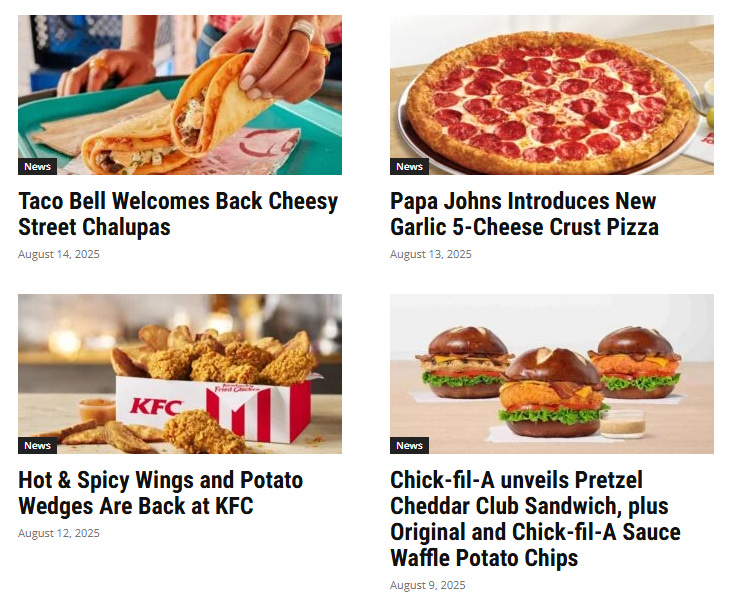 Some, like Fast Food Post, seem to just uncritically share every press release issued by a fast-food company. It's comprehensive - you'll never miss a new shake flavor or movie tie-in meal - but nobody would accuse FFP of having a strong editorial perspective. They do have an unusually nice layout for this industry, I'll give them that.