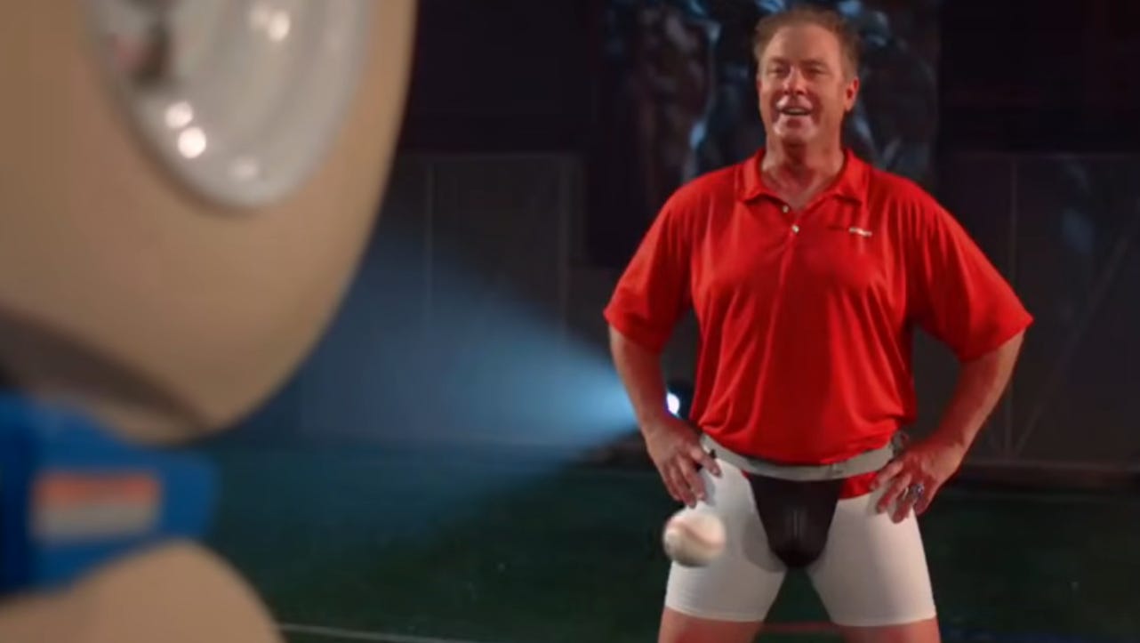 A ruddy man in his 50s squats with each foot on a different Gatorade jug. He’s wearing a t-shirt, a helmet, goggles, and white compression shorts - at least, that’s what we can see he’s wearing. From a few feet away, a pitching machine fires a baseball right at his crotch.
