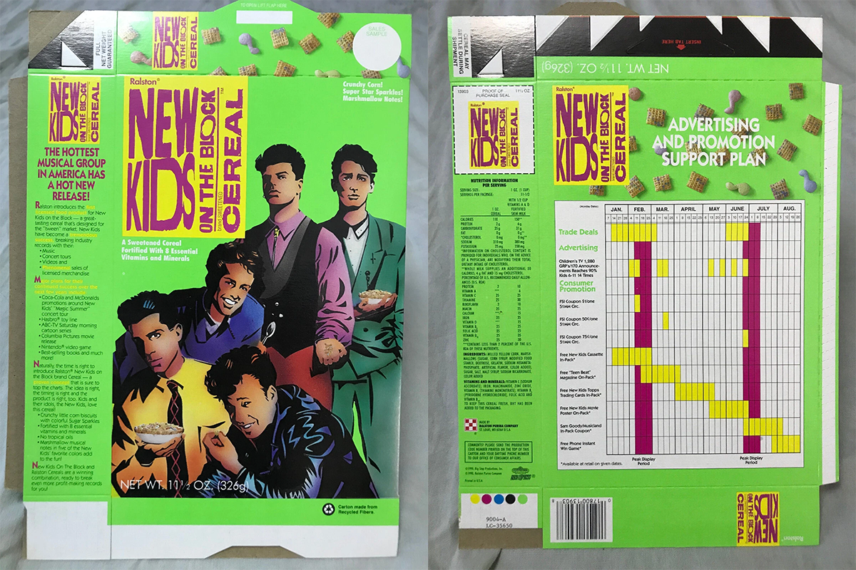 You know what's weird? Among the kajillion licensed cereals in the '80s and '90s, there were pretty much none for music acts. Scrolling through Discontinued Foods, it seems like there was a cereal for every Nintendo game, Saturday morning cartoon, and point guard whose team made a deep playoff run. But the only music one I've been able to find was never even actually released. New Kids on the Block cereal was a prototype circulated to drum up interest among distributors and stores. Evidently it didn't drum up much, because it died there. Like trading cards, promotional breakfast cereal was one of those things that just didn't translate to music.