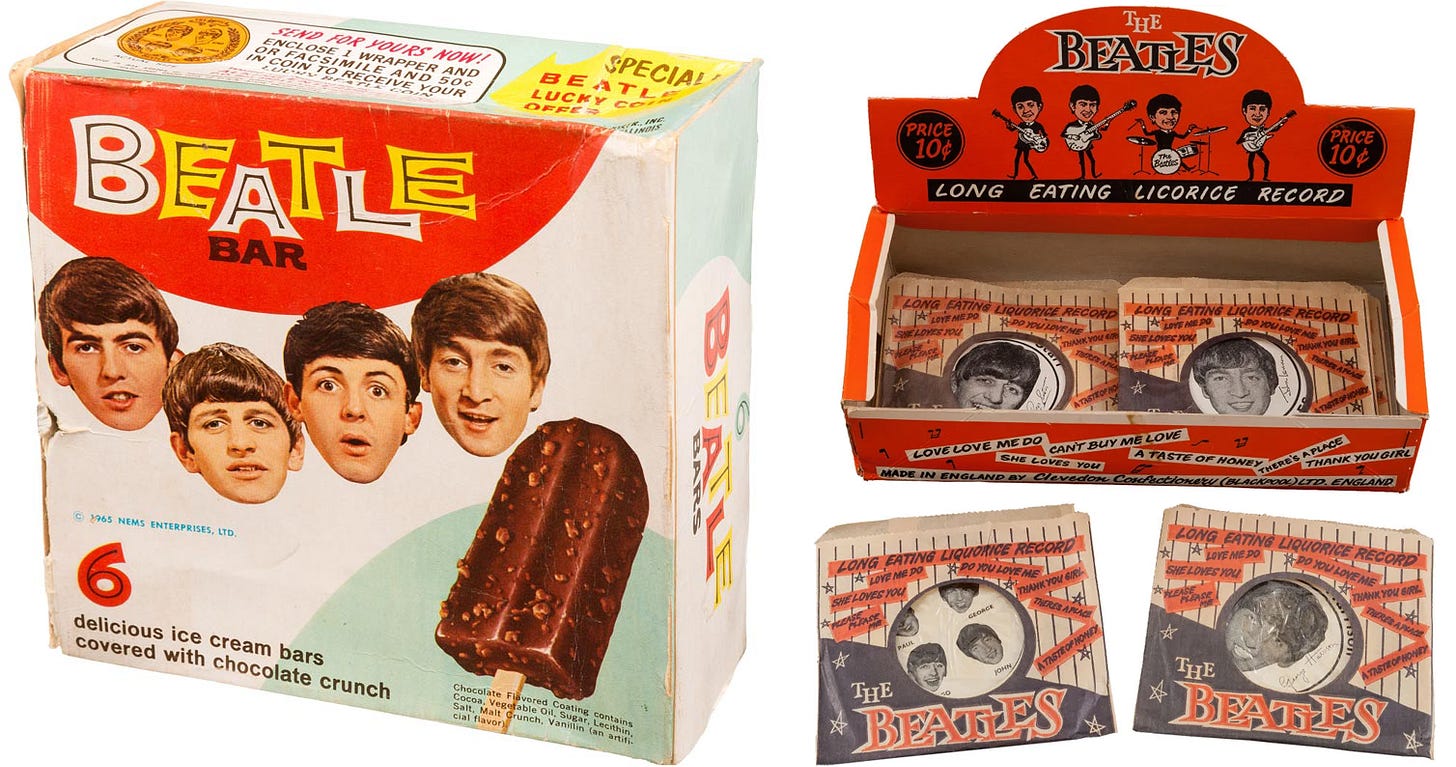 Of the deluge of Beatles merchandise in 1964, very little of it was edible. Here's a box of generic ice cream bars with most of the moptops looking decidedly unenthused: Paul is frozen in terror, Ringo's about to cry, and George sneers with contempt. They seem more cheerful on the packaging for their licorice records, especially given that the "treat" inside is a disc of black licorice. Of course, there's no chance the Beatles had the first thing to do with these products, including being aware of their existence.