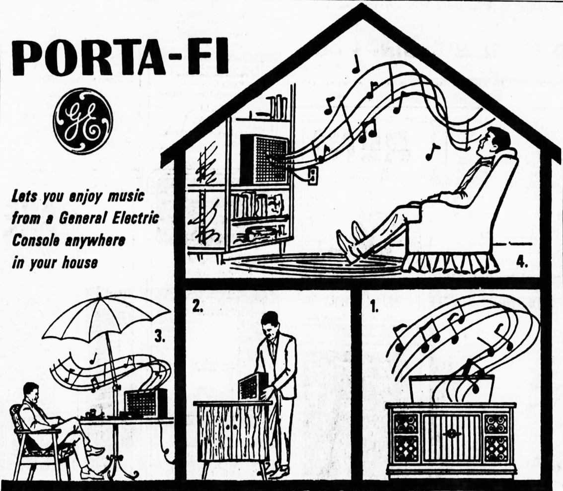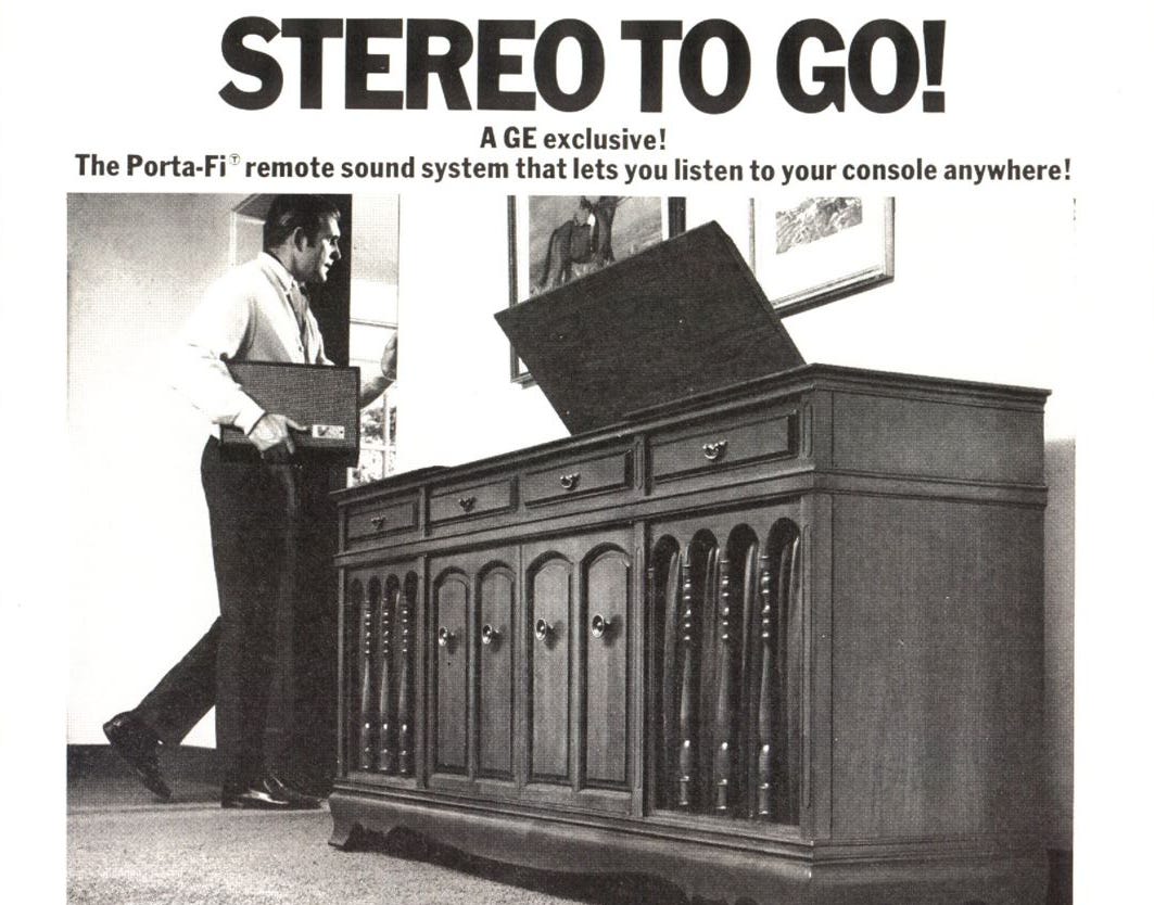 “It’s like having any room in your house wired for sound - without one extra wire.” That was General Electric’s pitch in the 1965 ad campaign for their new Porta-Fi system. One big console was the source of the records or radio, while a shoebox-sized portable speaker brought the audio to anywhere in the house with an AC outlet.